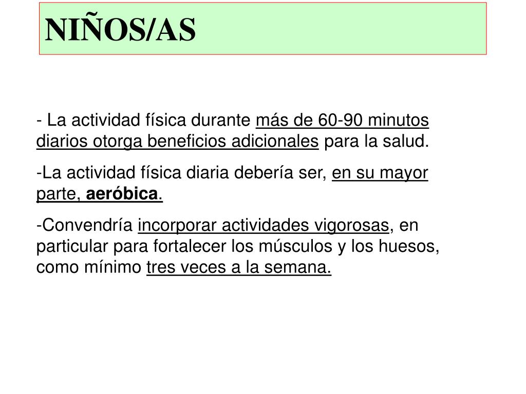 NIÑOS/AS • - La actividad física durante más de 60-90 minutos diarios otorga beneficios adicionales para la salud. • La actividad física diaria debería ser, en su mayor parte, aeróbica. • Convendría incorporar actividades vigorosas, en particular para fortalecer los músculos y los huesos, como mínimo tres veces a la semana.
