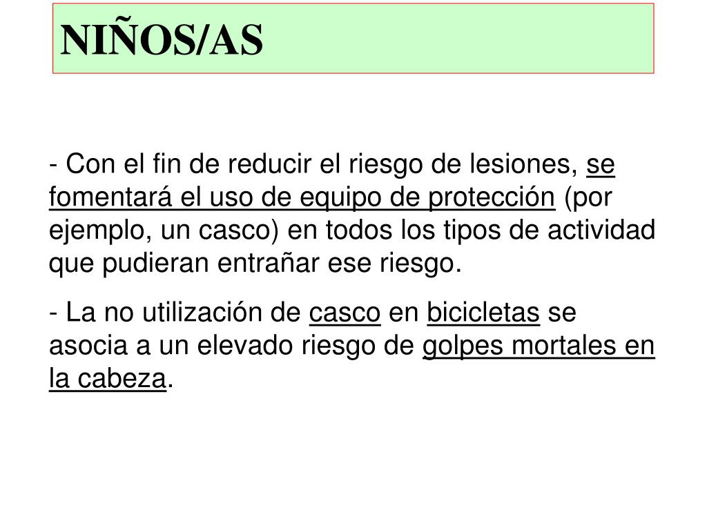 NIÑOS/AS • Con el fin de reducir el riesgo de lesiones, se fomentará el uso de equipo de protección (por ejemplo, un casco) en todos los tipos de actividad que pudieran entrañar ese riesgo. • La no utilización de casco en bicicletas se asocia a un elevado riesgo de golpes mortales en la cabeza.