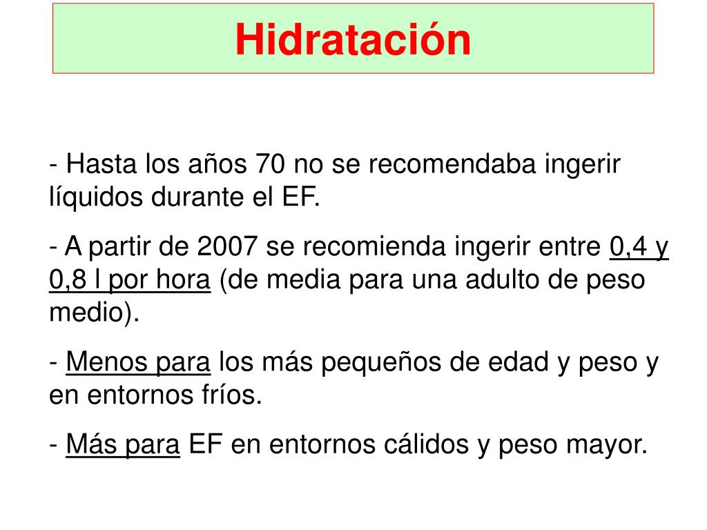 Hidratación • Hasta los años 70 no se recomendaba ingerir líquidos durante el EF. • A partir de 2007 se recomienda ingerir entre 0,4 y 0,8 l por hora (de media para una adulto de peso medio). • Menos para los más pequeños de edad y peso y en entornos fríos. • Más para EF en entornos cálidos y peso mayor.