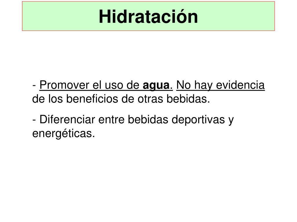 Hidratación • Promover el uso de agua.No hay evidencia de los beneficios de otras bebidas. • Diferenciar entre bebidas deportivas y energéticas.