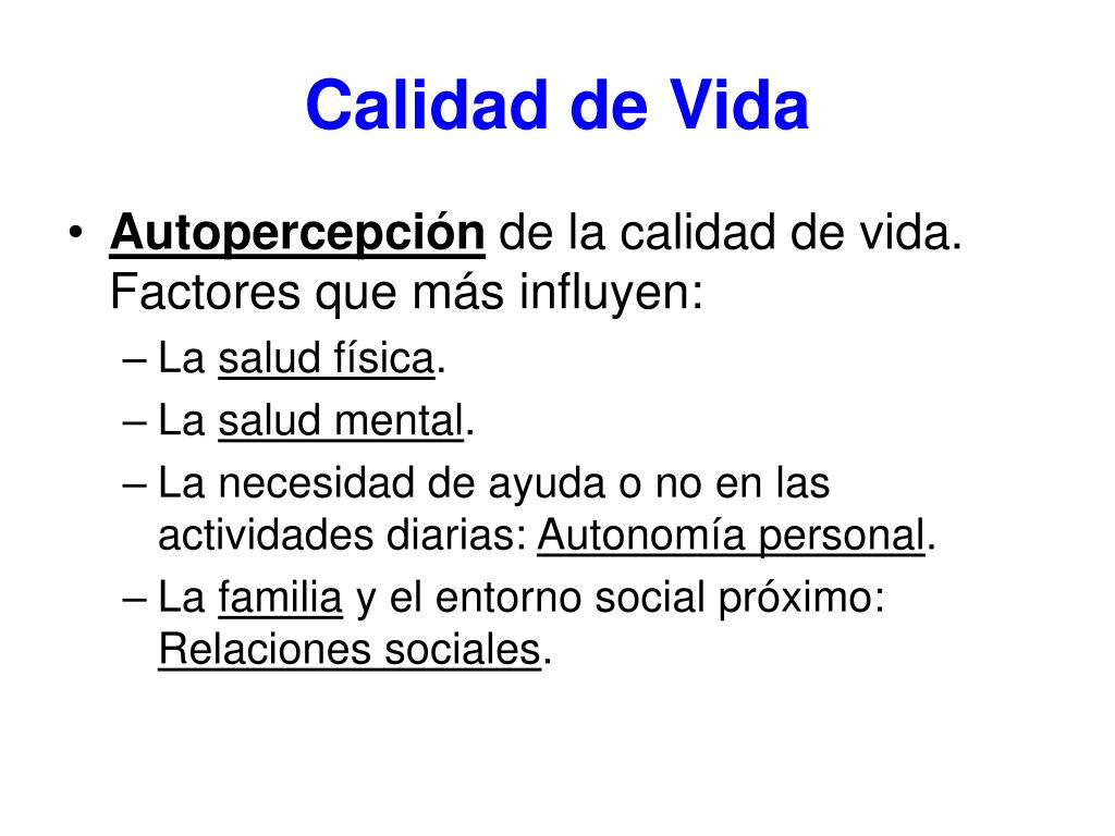 Autopercepción de la calidad de vida. Factores que más influyen: La salud física. La salud mental. La necesidad de ayuda o no en las actividades diarias: Autonomía personal. La familia y el entorno social próximo: Relaciones sociales. Calidad de Vida