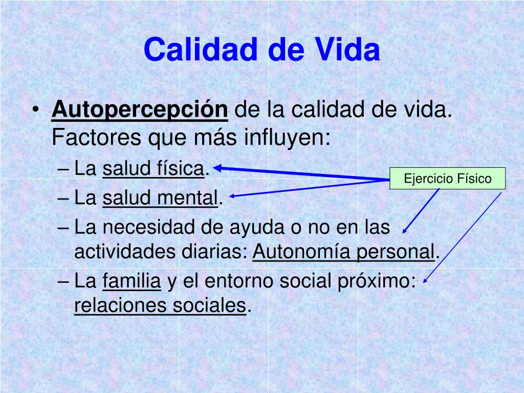 Autopercepción de la calidad de vida. Factores que más influyen: La salud física. La salud mental. La necesidad de ayuda o no en las actividades diarias: Autonomía personal. La familia y el entorno social próximo: relaciones sociales. Calidad de Vida Ejercicio Físico