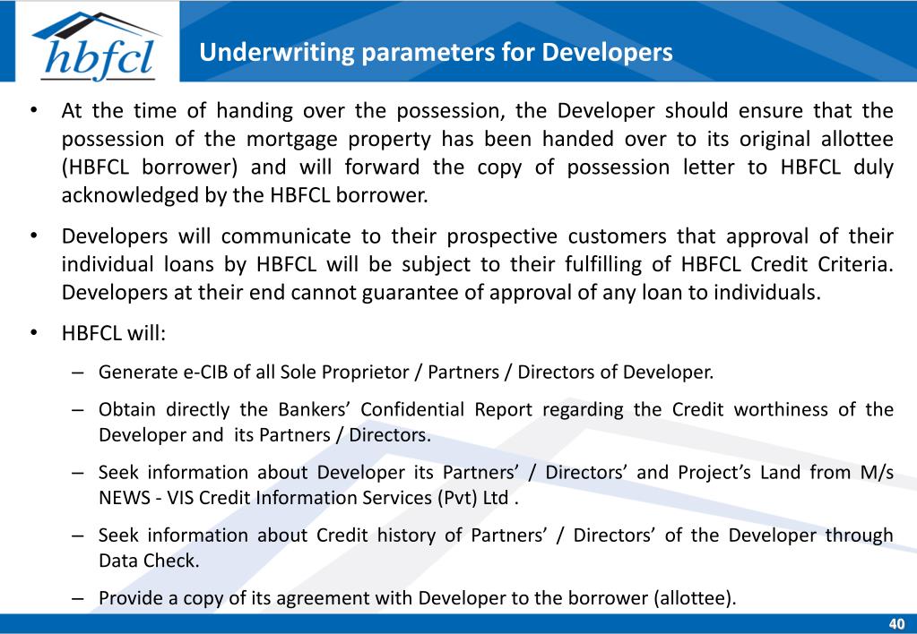 Underwriting parameters for Developers • At the time of handing over the possession, the Developer should ensure that the possession of the mortgage property has been handed over to its original allottee (HBFCL borrower) and will forward the copy of possession letter to HBFCL duly acknowledged by the HBFCL borrower. • Developers will communicate to their prospective customers that approval of their individual loans by HBFCL will be subject to their fulfilling of HBFCL Credit Criteria. Developers at their end cannot guarantee of approval of any loan to individuals. • HBFCL will: • Generate e-CIB of all Sole Proprietor / Partners / Directors of Developer. • Obtain directly the Bankers’ Confidential Report regarding the Credit worthiness of the Developer and its Partners / Directors. • Seek information about Developer its Partners’ / Directors’ and Project’s Land from M/s NEWS - VIS Credit Information Services (Pvt) Ltd . • Seek information about Credit history of Partners’ / Directors’ of the Developer through Data Check. • Provide a copy of its agreement with Developer to the borrower (allottee). *