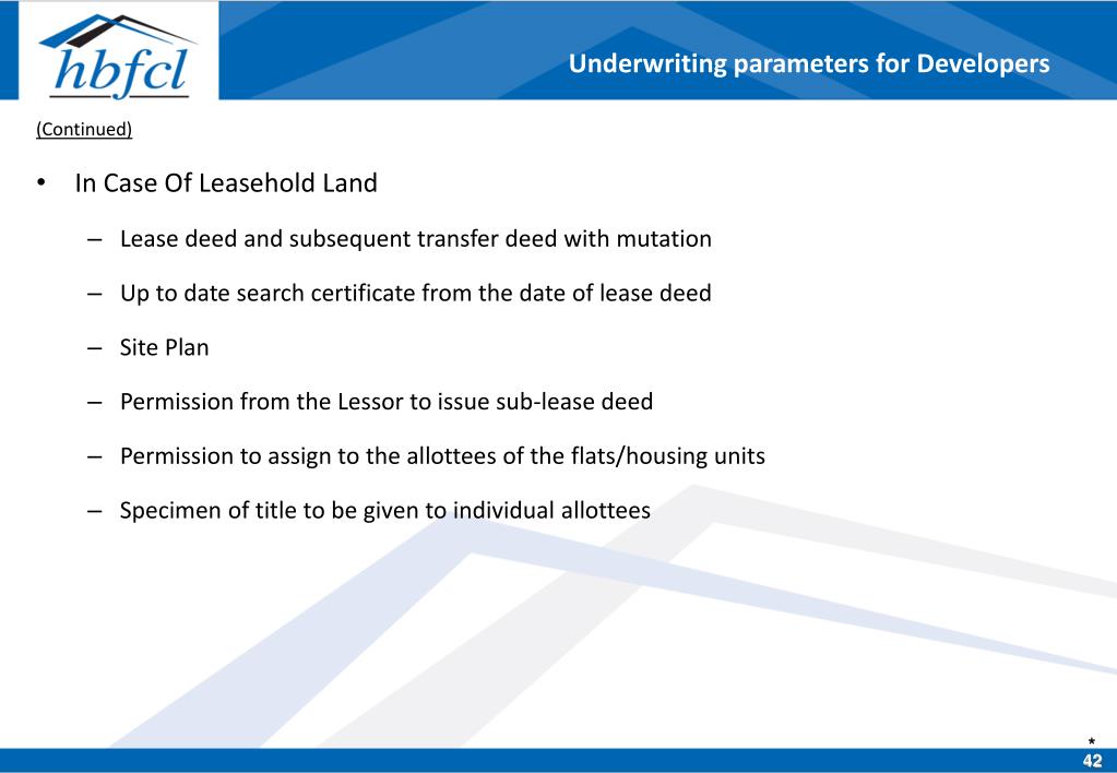 Underwriting parameters for Developers (Continued) • In Case Of Leasehold Land • Lease deed and subsequent transfer deed with mutation • Up to date search certificate from the date of lease deed • Site Plan • Permission from the Lessor to issue sub-lease deed • Permission to assign to the allottees of the flats/housing units • Specimen of title to be given to individual allottees *