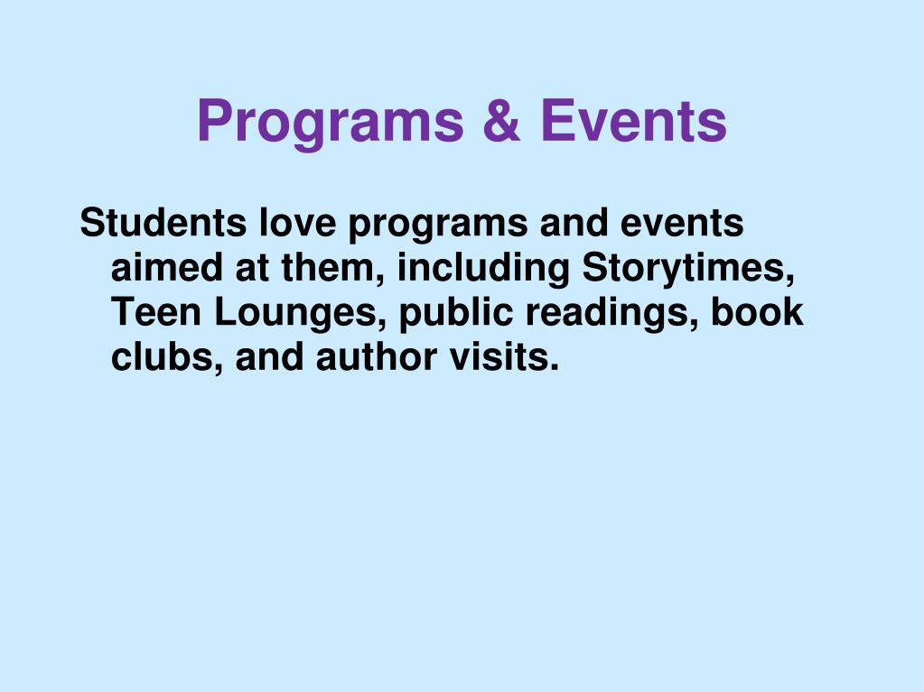 Programs & Events Students love programs and events aimed at them, including Storytimes, Teen Lounges, public readings, book clubs, and author visits.