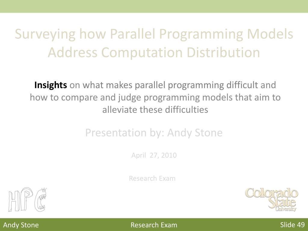 Surveying how Parallel Programming Models Address Computation Distribution. Presentation by: Andy Stone. Insights on what makes parallel programming difficult and how to compare and judge programming models that aim to alleviate these difficulties. April 27, 2010. Research Exam. Slide 1.