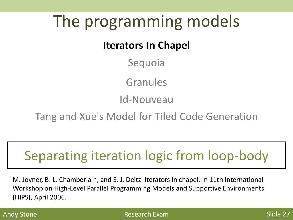 The programming models Iterators In Chapel Sequoia Granules Id-Nouveau Tang and Xue's Model for Tiled Code Generation Separating iteration logic from loop-body M. Joyner, B. L. Chamberlain, and S. J. Deitz. Iterators in chapel. In 11th International Workshop on High-Level Parallel Programming Models and Supportive Environments (HIPS), April 2006. Slide 27 Andy Stone Research Exam