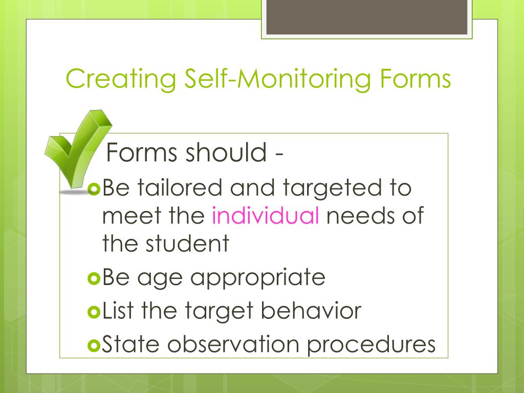 Creating Self-Monitoring Forms Forms should - • Be tailored and targeted to meet the individual needs of the student • Be age appropriate • List the target behavior • State observation procedures
