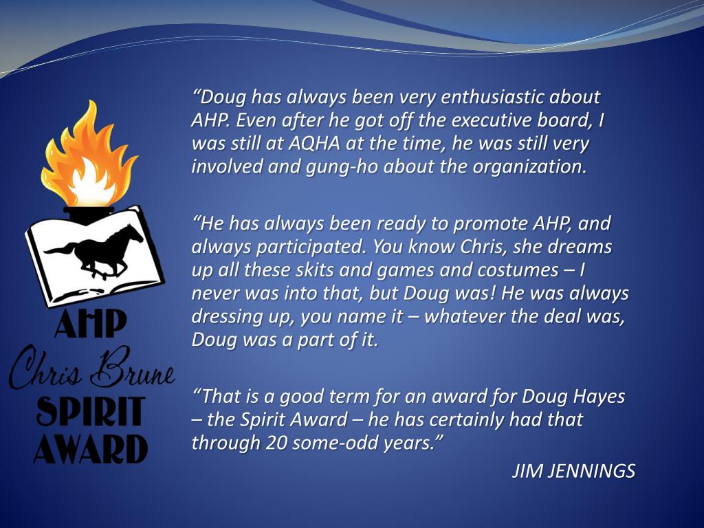 “Doug has always been very enthusiastic about AHP. Even after he got off the executive board, I was still at AQHA at the time, he was still very involved and gung-ho about the organization. “He has always been ready to promote AHP, and always participated. You know Chris, she dreams up all these skits and games and costumes – I never was into that, but Doug was! He was always dressing up, you name it – whatever the deal was, Doug was a part of it. “That is a good term for an award for Doug Hayes – the Spirit Award – he has certainly had that through 20 some-odd years.” JIM JENNINGS