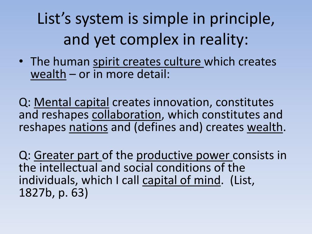 List’s system is simple in principle, and yet complex in reality: • The human spirit creates culture which creates wealth – or in more detail: Q: Mental capital creates innovation, constitutes and reshapes collaboration, which constitutes and reshapes nations and (defines and) creates wealth. Q: Greater part of the productive power consists in the intellectual and social conditions of the individuals, which I call capital of mind. (List, 1827b, p. 63)