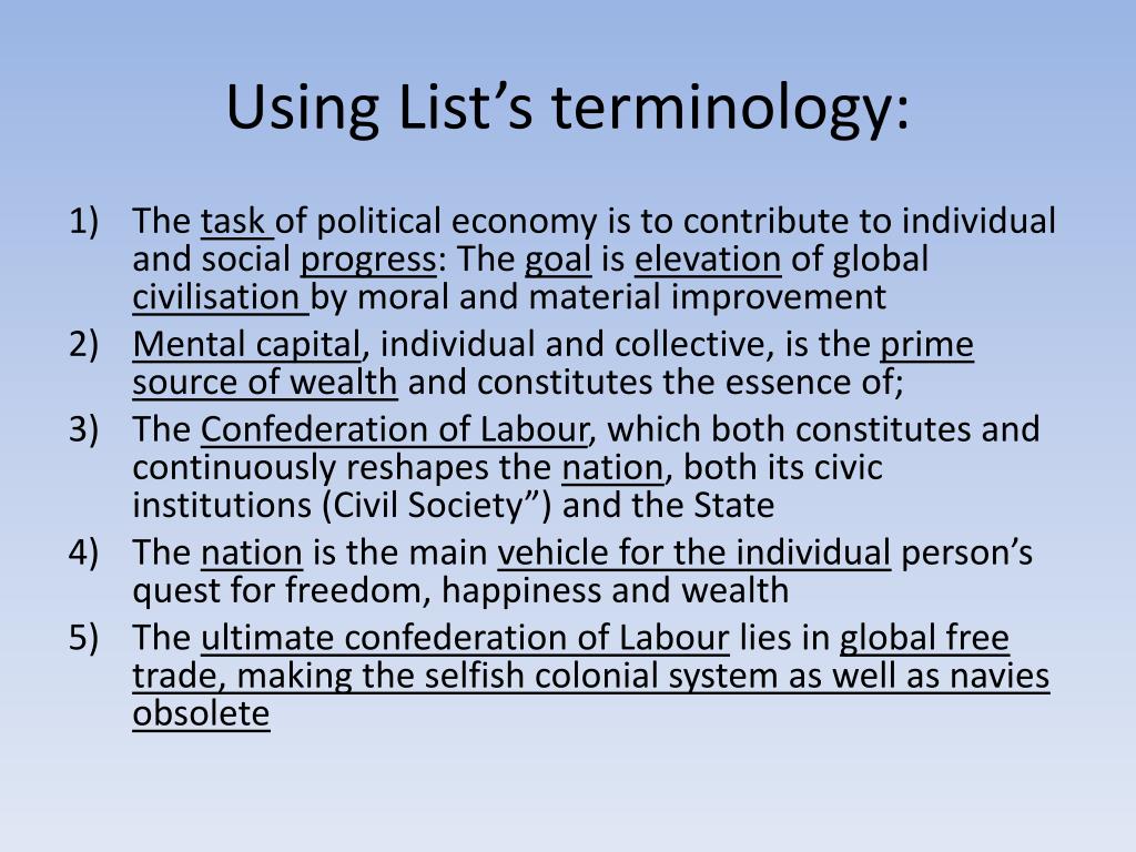 Using List’s terminology: • The task of political economy is to contribute to individual and social progress: The goal is elevation of global civilisation by moral and material improvement • Mental capital, individual and collective, is the prime source of wealth and constitutes the essence of; • The Confederation of Labour, which both constitutes and continuously reshapes the nation, both its civic institutions (Civil Society”) and the State • The nation is the main vehicle for the individual person’s quest for freedom, happiness and wealth • The ultimate confederation of Labour lies in global free trade, making the selfish colonial system as well as navies obsolete