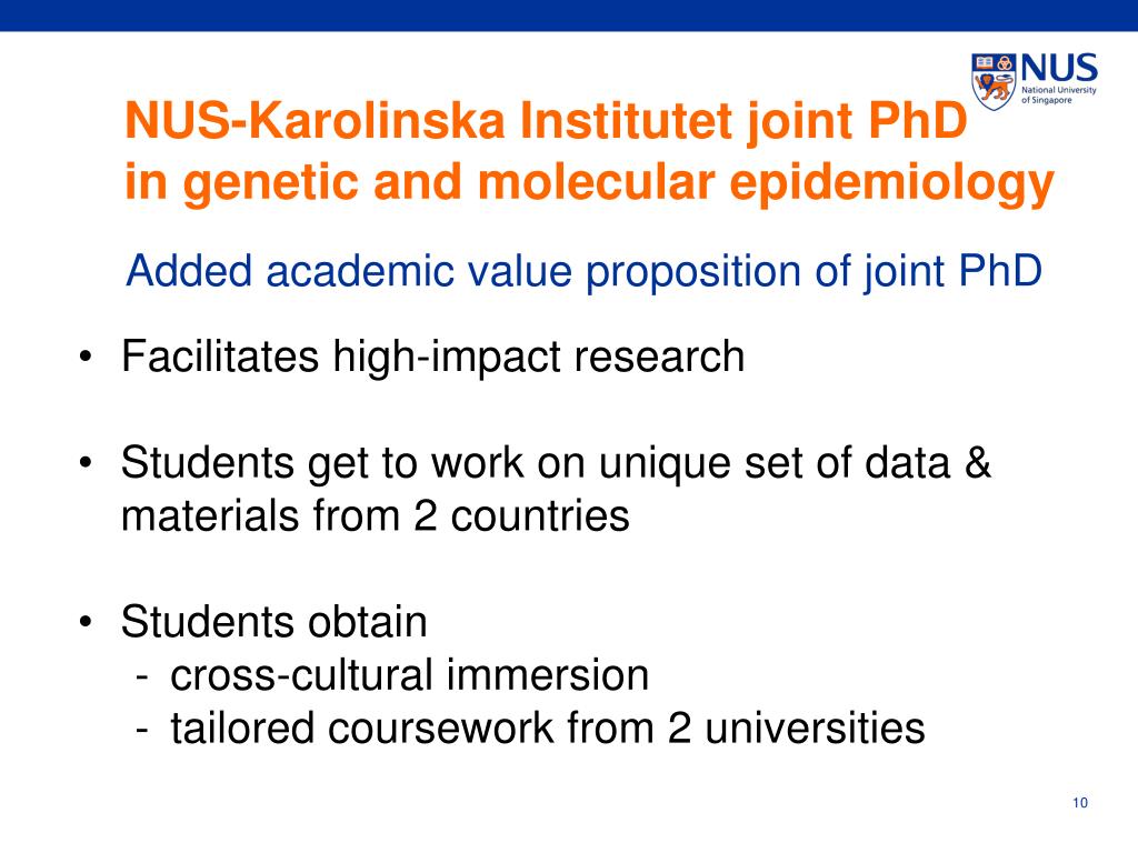 NUS-Karolinska Institutet joint PhD in genetic and molecular epidemiology Added academic value proposition of joint PhD • Facilitates high-impact research • Students get to work on unique set of data & materials from 2 countries • Students obtain • cross-cultural immersion • tailored coursework from 2 universities