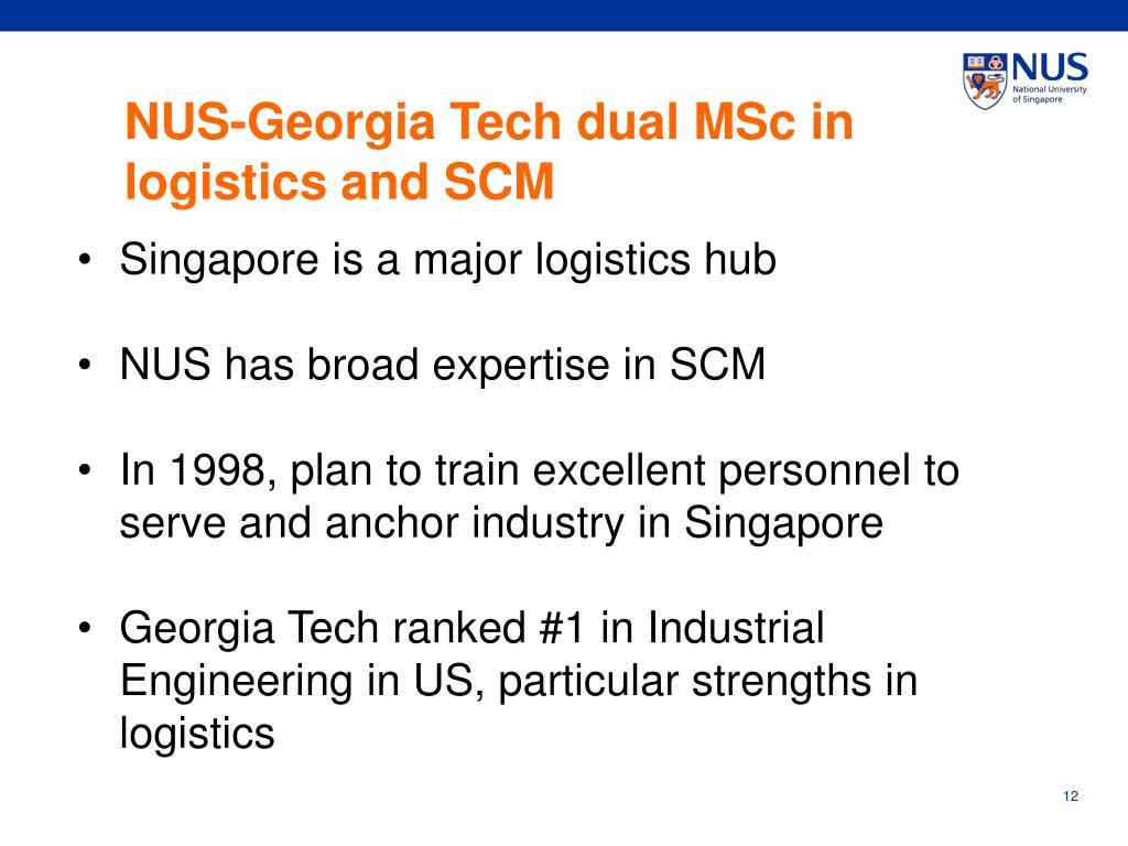 NUS-Georgia Tech dual MSc in logistics and SCM • Singapore is a major logistics hub • NUS has broad expertise in SCM • In 1998, plan to train excellent personnel to serve and anchor industry in Singapore • Georgia Tech ranked #1 in Industrial Engineering in US, particular strengths in logistics
