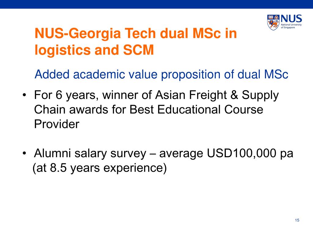 NUS-Georgia Tech dual MSc in logistics and SCM Added academic value proposition of dual MSc • For 6 years, winner of Asian Freight & Supply Chain awards for Best Educational Course Provider • Alumni salary survey – average USD100,000 pa • (at 8.5 years experience)