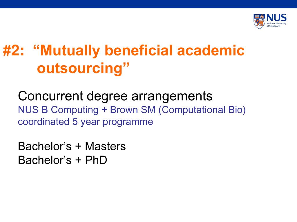 #2: “Mutually beneficial academic outsourcing” • Concurrent degree arrangements • NUS B Computing + Brown SM (Computational Bio) • coordinated 5 year programme • Bachelor’s + Masters • Bachelor’s + PhD