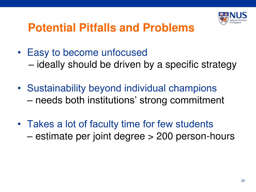 Potential Pitfalls and Problems • Easy to become unfocused • – ideally should be driven by a specific strategy • Sustainability beyond individual champions • – needs both institutions’ strong commitment • Takes a lot of faculty time for few students • – estimate per joint degree > 200 person-hours