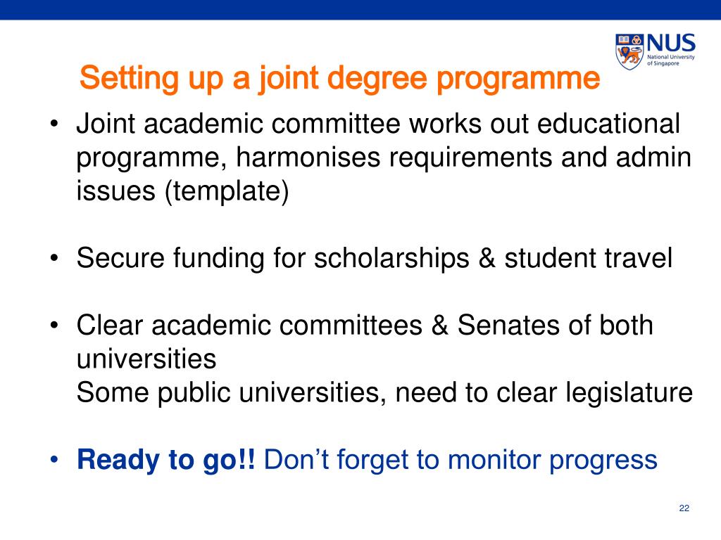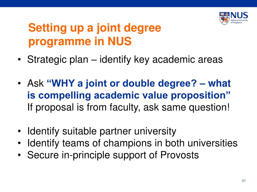 Setting up a joint degree programme in NUS • Strategic plan – identify key academic areas • Ask“WHY a joint or double degree? – what is compelling academic value proposition” • If proposal is from faculty, ask same question! • Identify suitable partner university • Identify teams of champions in both universities • Secure in-principle support of Provosts