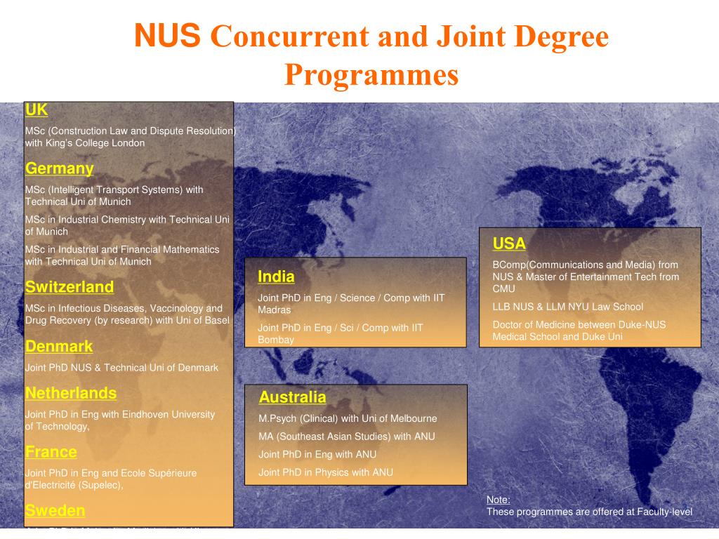 India Joint PhD in Eng / Science / Comp with IIT Madras Joint PhD in Eng / Sci / Comp with IIT Bombay USA BComp(Communications and Media) from NUS & Master of Entertainment Tech from CMU LLB NUS & LLM NYU Law School Doctor of Medicine between Duke-NUS Medical School and Duke Uni • Australia • M.Psych (Clinical) with Uni of Melbourne • MA (Southeast Asian Studies) with ANU • Joint PhD in Eng with ANU • Joint PhD in Physics with ANU NUS Concurrent and Joint Degree Programmes UK MSc (Construction Law and Dispute Resolution) with King’s College London Germany MSc (Intelligent Transport Systems) with Technical Uni of Munich MSc in Industrial Chemistry with Technical Uni of Munich MSc in Industrial and Financial Mathematics with Technical Uni of Munich Switzerland MSc in Infectious Diseases, Vaccinology and Drug Recovery (by research) with Uni of Basel Denmark Joint PhD NUS & Technical Uni of Denmark Netherlands Joint PhD in Eng with Eindhoven University of Technology, France Joint PhD in Eng and Ecole Supérieure d'Electricité (Supelec), Sweden Joint PhD in Molecular Medicine with KI Note: These programmes are offered at Faculty-level