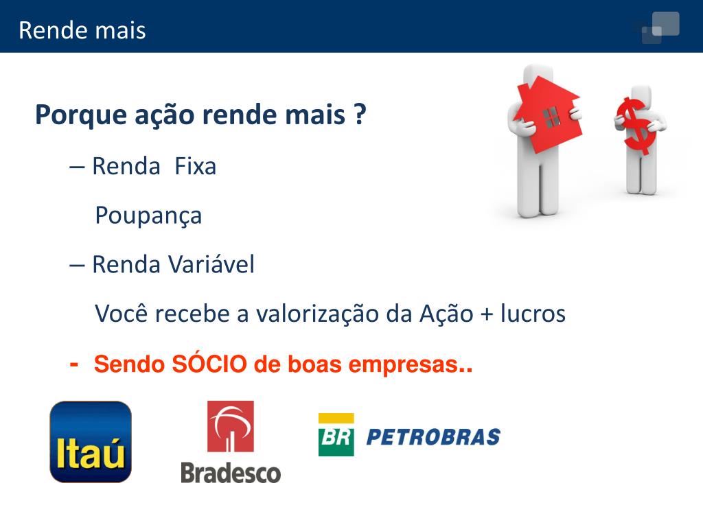 Rende mais Porque ação rende mais ? • Renda Fixa Poupança • Renda Variável Você recebe a valorização da Ação + lucros - Sendo SÓCIO de boas empresas..