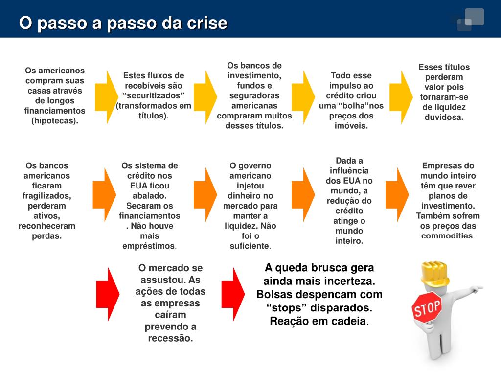 Os bancos de investimento, fundos e seguradoras americanas compraram muitos desses títulos. Esses títulos perderam valor pois tornaram-se de liquidez duvidosa. Os americanos compram suas casas através de longos financiamentos (hipotecas). Estes fluxos de recebíveis são “securitizados” (transformados em títulos). Todo esse impulso ao crédito criou uma “bolha”nos preços dos imóveis. Dada a influência dos EUA no mundo, a redução do crédito atinge o mundo inteiro. Os bancos americanos ficaram fragilizados, perderam ativos, reconheceram perdas. Os sistema de crédito nos EUA ficou abalado. Secaram os financiamentos. Não houve mais empréstimos. O governo americano injetou dinheiro no mercado para manter a liquidez. Não foi o suficiente. Empresas do mundo inteiro têm que rever planos de investimento. Também sofrem os preços das commodities. O passo a passo da crise A queda brusca gera ainda mais incerteza. Bolsas despencam com “stops” disparados. Reação em cadeia. O mercado se assustou. As ações de todas as empresas caíram prevendo a recessão.