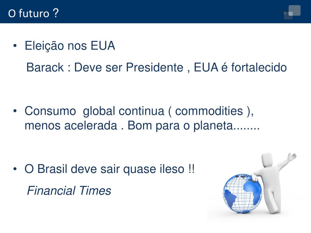 O futuro ? • Eleição nos EUA • Barack : Deve ser Presidente , EUA é fortalecido • Consumo global continua ( commodities ), menos acelerada . Bom para o planeta........ • O Brasil deve sair quase ileso !! • Financial Times