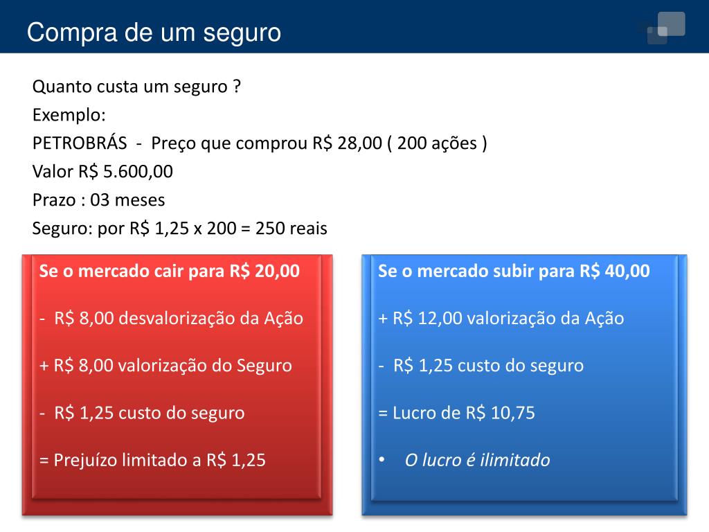 Compra de um seguro Quanto custa um seguro ? Exemplo: PETROBRÁS - Preço que comprou R$ 28,00 ( 200 ações ) Valor R$ 5.600,00 Prazo : 03 meses Seguro: por R$ 1,25 x 200 = 250 reais Se o mercado cair para R$ 20,00 - R$ 8,00 desvalorização da Ação + R$ 8,00 valorização do Seguro - R$ 1,25 custo do seguro = Prejuízo limitado a R$ 1,25 • Se o mercado subir para R$ 40,00 • + R$ 12,00 valorização da Ação • - R$ 1,25 custo do seguro • = Lucro de R$ 10,75 • O lucro é ilimitado www.xpi.com.br