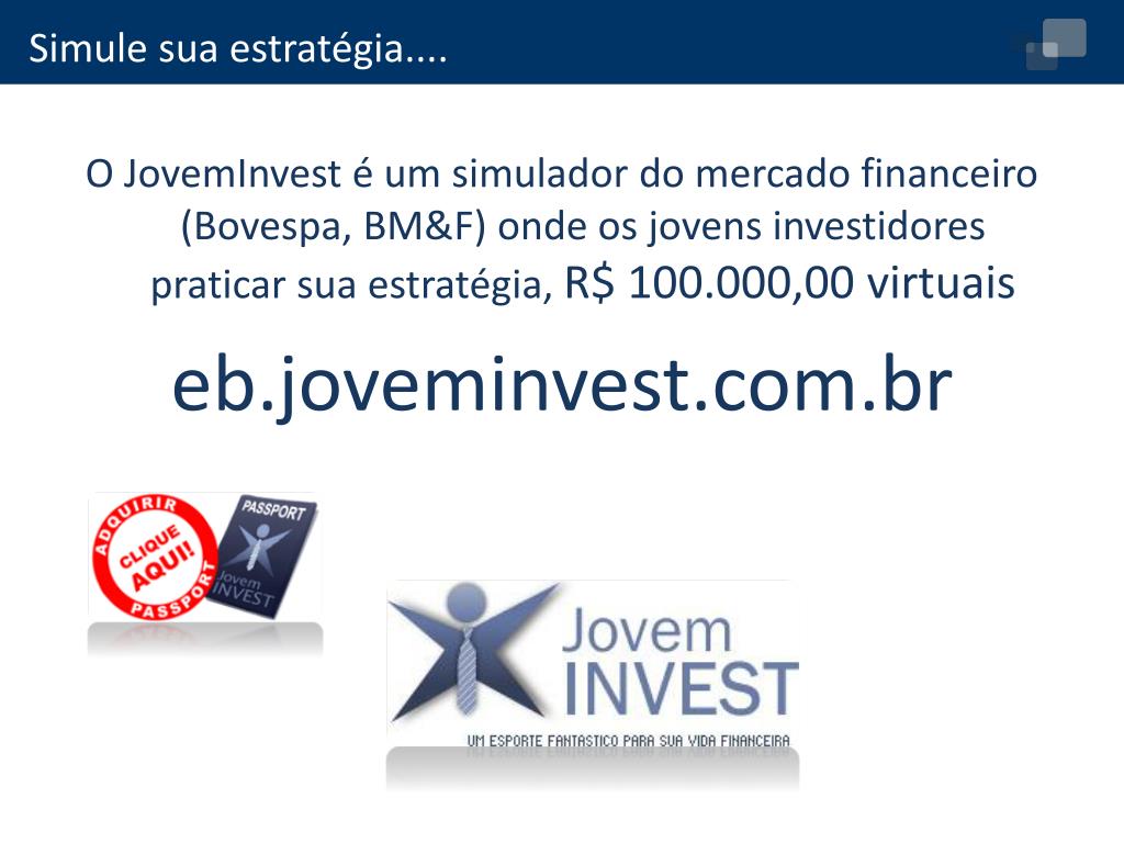 Simule sua estratégia.... O JovemInvest é um simulador do mercado financeiro (Bovespa, BM&F) onde os jovens investidores praticar sua estratégia, R$ 100.000,00 virtuais eb.joveminvest.com.br