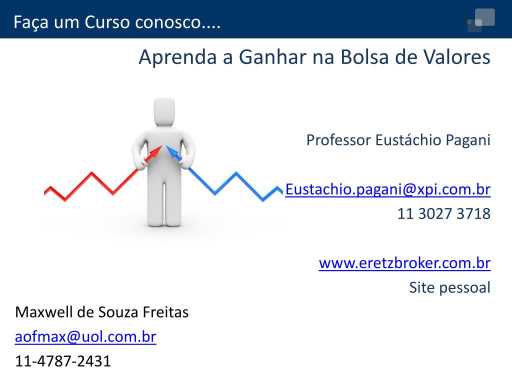Faça um Curso conosco.... Aprenda a GanharnaBolsa de Valores Professor Eustáchio Pagani Eustachio.pagani@xpi.com.br 11 3027 3718 www.eretzbroker.com.br Site pessoal Maxwell de Souza Freitas aofmax@uol.com.br 11-4787-2431