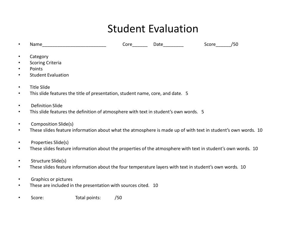 Student Evaluation • Name_________________________ Core______ Date________ Score______/50 • Category • Scoring Criteria • Points • Student Evaluation • Title Slide • This slide features the title of presentation, student name, core, and date. 5 • Definition Slide • This slide features the definition of atmosphere with text in student’s own words. 5 • Composition Slide(s) • These slides feature information about what the atmosphere is made up of with text in student’s own words. 10 • Properties Slide(s) • These slides feature information about the properties of the atmosphere with text in student’s own words. 10 • Structure Slide(s) • These slides feature information about the four temperature layers with text in student’s own words. 10 • Graphics or pictures • These are included in the presentation with sources cited. 10 • Score: Total points: /50