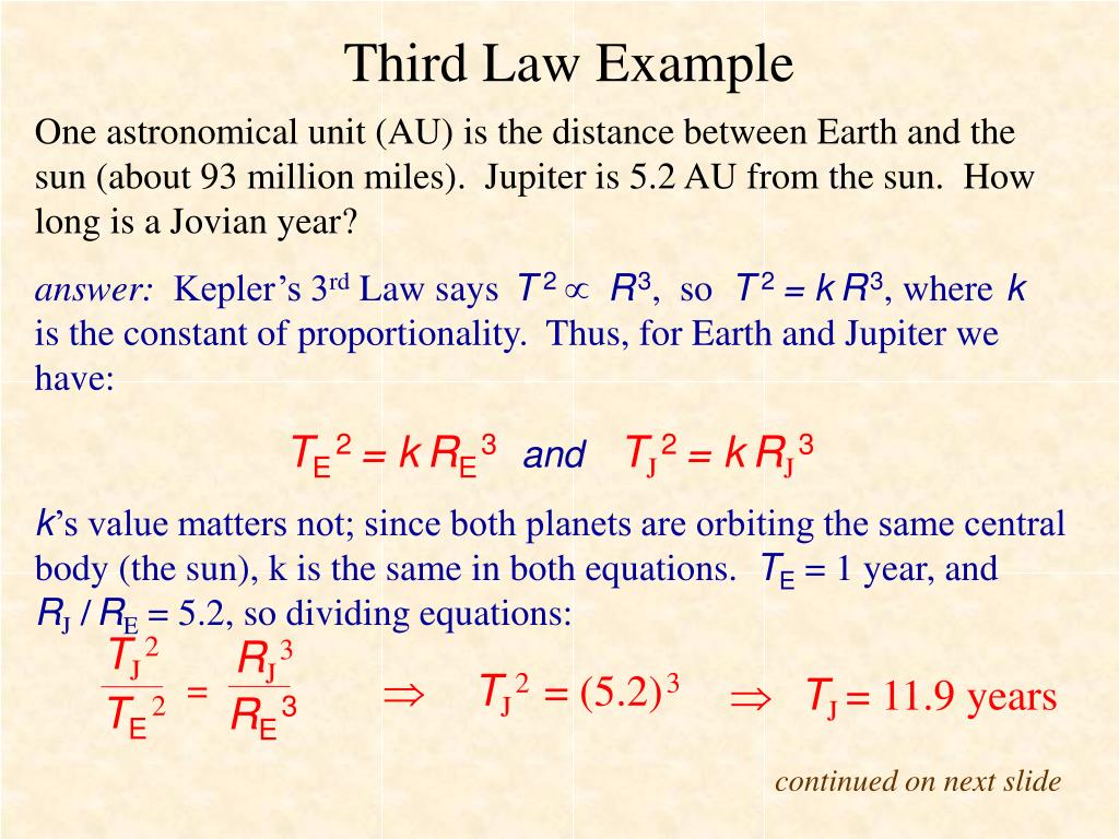 Third Law Example One astronomical unit (AU) is the distance between Earth and the sun (about 93 million miles). Jupiter is 5.2 AU from the sun. How long is a Jovian year? answer:Kepler’s 3rd Law saysT2 R3, so T2= kR3, wherek is the constant of proportionality. Thus, for Earth and Jupiter we have: TE2= kRE3andTJ2= kRJ3 k’s value matters not; since both planets are orbiting the same central body (the sun), k is the same in both equations. TE = 1 year, and RJ /RE = 5.2, so dividing equations: TJ2 RJ3 TJ2 = (5.2)3 = TJ = 11.9 years TE2 RE3 continued on next slide