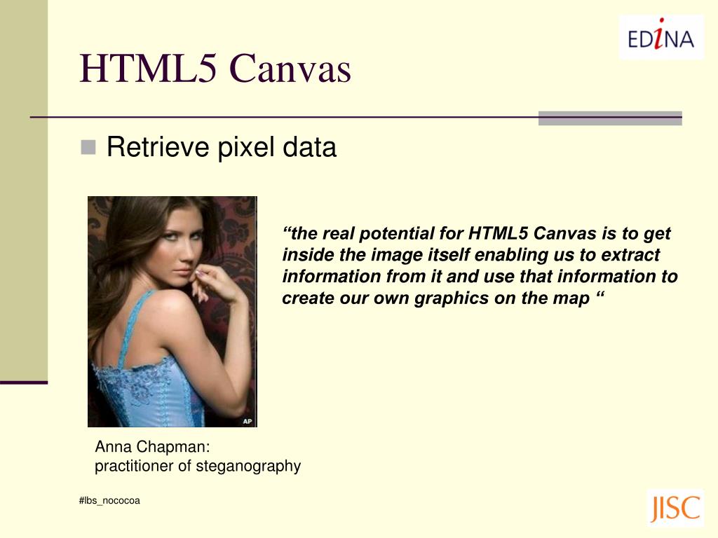 HTML5 Canvas • Retrieve pixel data “the real potential for HTML5 Canvas is to get inside the image itself enabling us to extract information from it and use that information to create our own graphics on the map “ Anna Chapman: practitioner of steganography