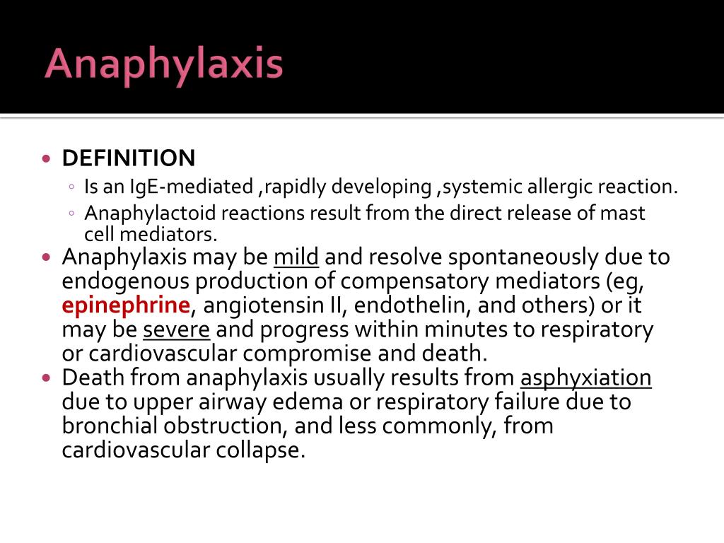 Anaphylaxis • DEFINITION • Is an IgE-mediated ,rapidly developing ,systemic allergic reaction. • Anaphylactoid reactions result from the direct release of mast cell mediators. • Anaphylaxis may be mild and resolve spontaneously due to endogenous production of compensatory mediators (eg, epinephrine, angiotensin II, endothelin, and others) or it may be severe and progress within minutes to respiratory or cardiovascular compromise and death. • Death from anaphylaxis usually results from asphyxiation due to upper airway edema or respiratory failure due to bronchial obstruction, and less commonly, from cardiovascular collapse.