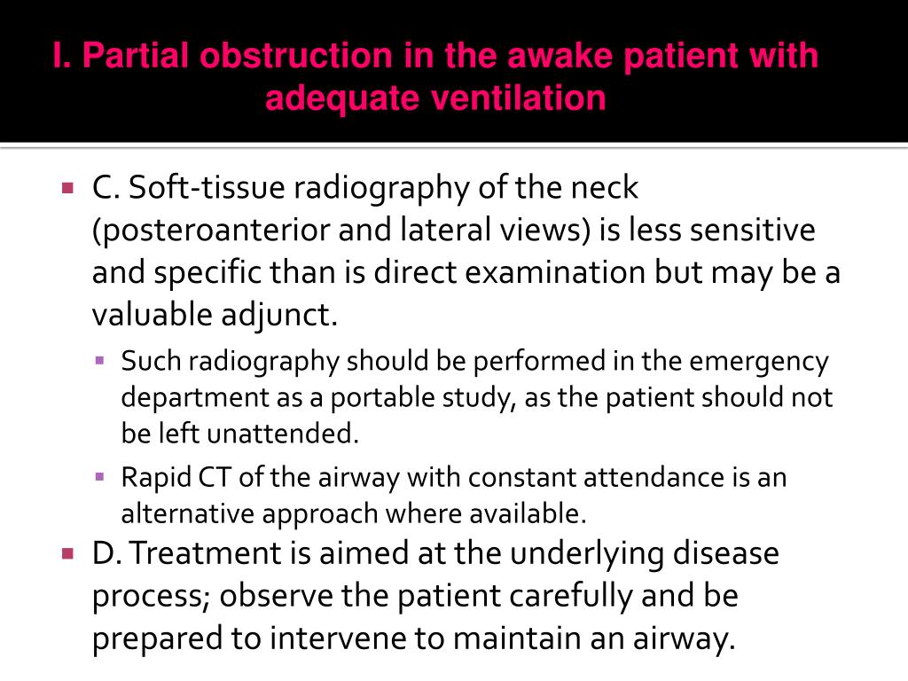 I. Partial obstruction in the awake patient with adequate ventilation • C. Soft-tissue radiography of the neck (posteroanterior and lateral views) is less sensitive and specific than is direct examination but may be a valuable adjunct. • Such radiography should be performed in the emergency department as a portable study, as the patient should not be left unattended. • Rapid CT of the airway with constant attendance is an alternative approach where available. • D. Treatment is aimed at the underlying disease process; observe the patient carefully and be prepared to intervene to maintain an airway.