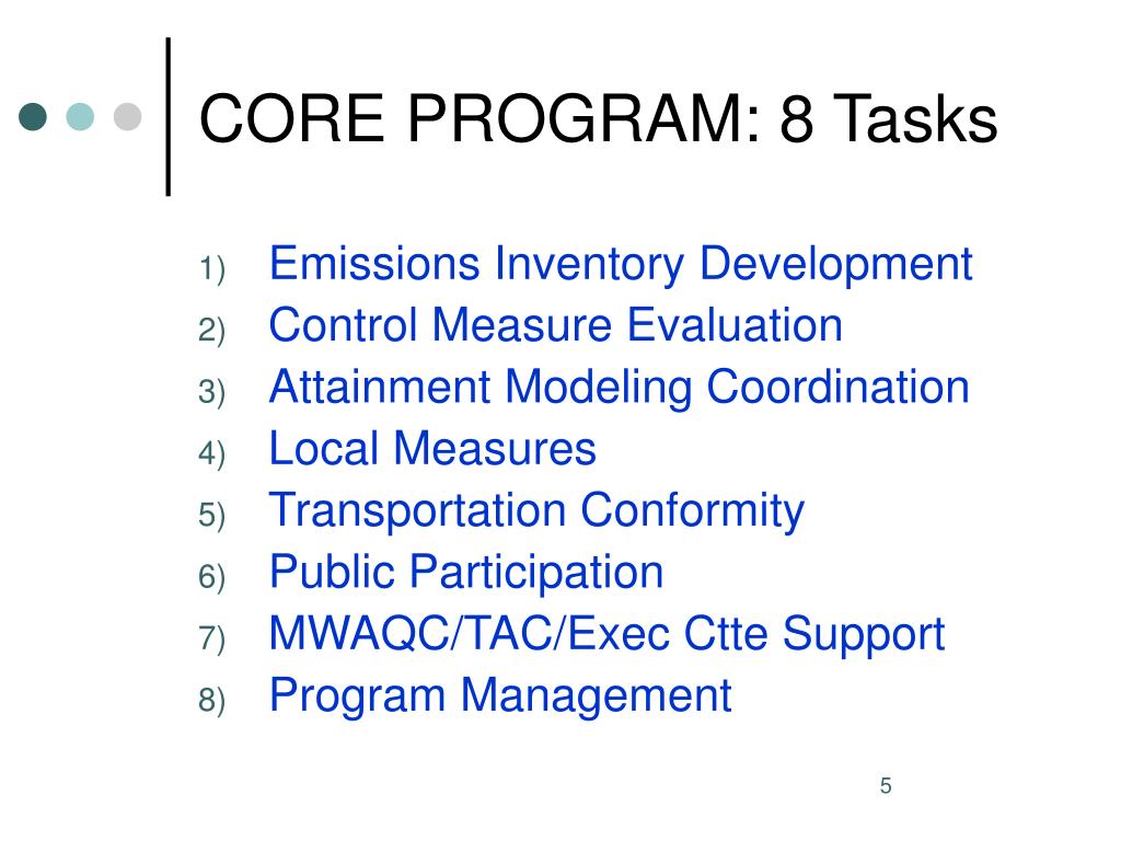 CORE PROGRAM: 8 Tasks • Emissions Inventory Development • Control Measure Evaluation • Attainment Modeling Coordination • Local Measures • Transportation Conformity • Public Participation • MWAQC/TAC/Exec Ctte Support • Program Management