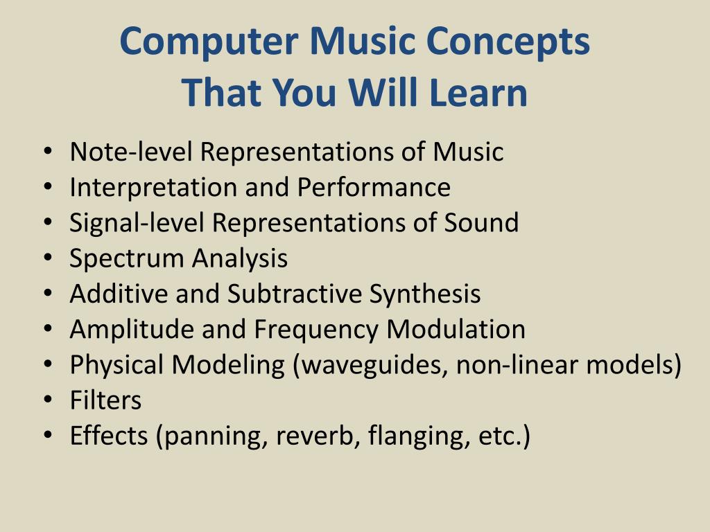 Computer Music ConceptsThat You Will Learn • Note-level Representations of Music • Interpretation and Performance • Signal-level Representations of Sound • Spectrum Analysis • Additive and Subtractive Synthesis • Amplitude and Frequency Modulation • Physical Modeling (waveguides, non-linear models) • Filters • Effects (panning, reverb, flanging, etc.)