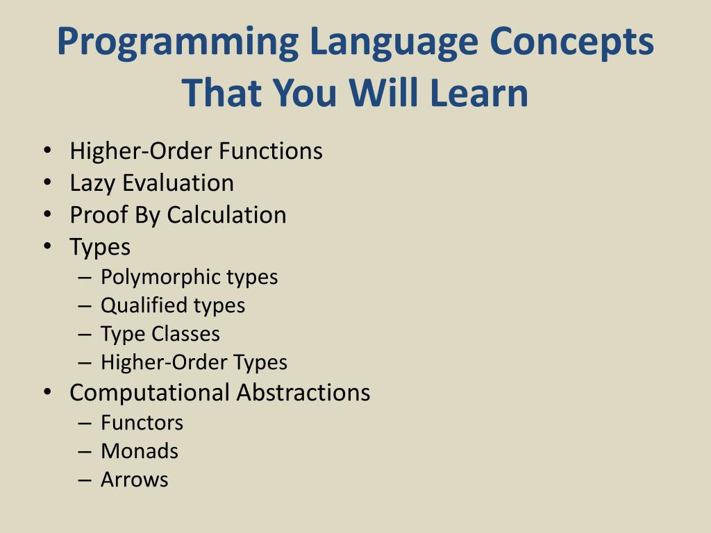 Programming Language ConceptsThat You Will Learn • Higher-Order Functions • Lazy Evaluation • Proof By Calculation • Types • Polymorphic types • Qualified types • Type Classes • Higher-Order Types • Computational Abstractions • Functors • Monads • Arrows