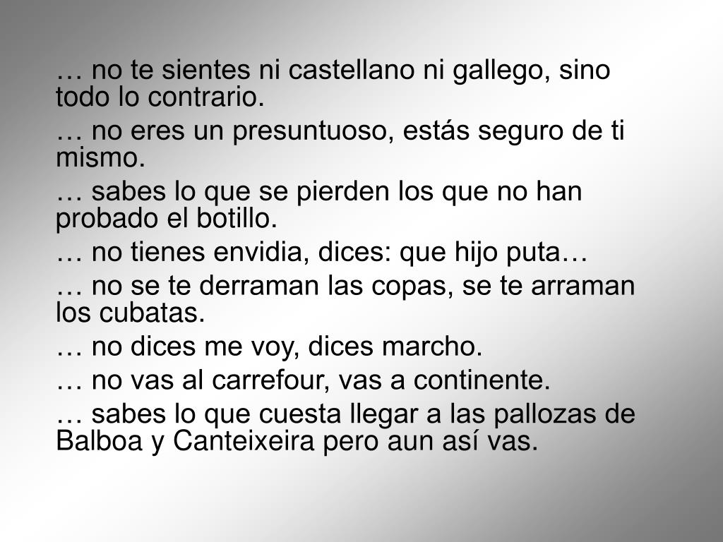 … no te sientes ni castellano ni gallego, sino todo lo contrario. … no eres un presuntuoso, estás seguro de ti mismo. … sabes lo que se pierden los que no han probado el botillo. … no tienes envidia, dices: que hijo puta… … no se te derraman las copas, se te arraman los cubatas. … no dices me voy, dices marcho. … no vas al carrefour, vas a continente. … sabes lo que cuesta llegar a las pallozas de Balboa y Canteixeira pero aun así vas.
