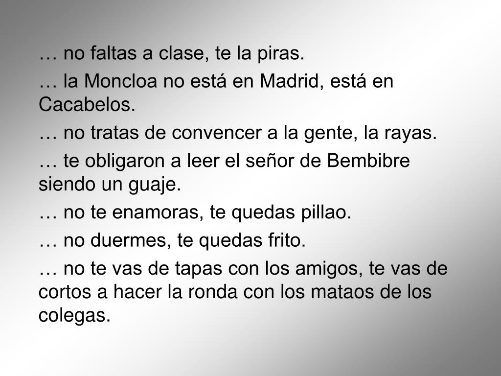 … no faltas a clase, te la piras. … la Moncloa no está en Madrid, está en Cacabelos. … no tratas de convencer a la gente, la rayas. … te obligaron a leer el señor de Bembibre siendo un guaje. … no te enamoras, te quedas pillao. … no duermes, te quedas frito. … no te vas de tapas con los amigos, te vas de cortos a hacer la ronda con los mataos de los colegas.