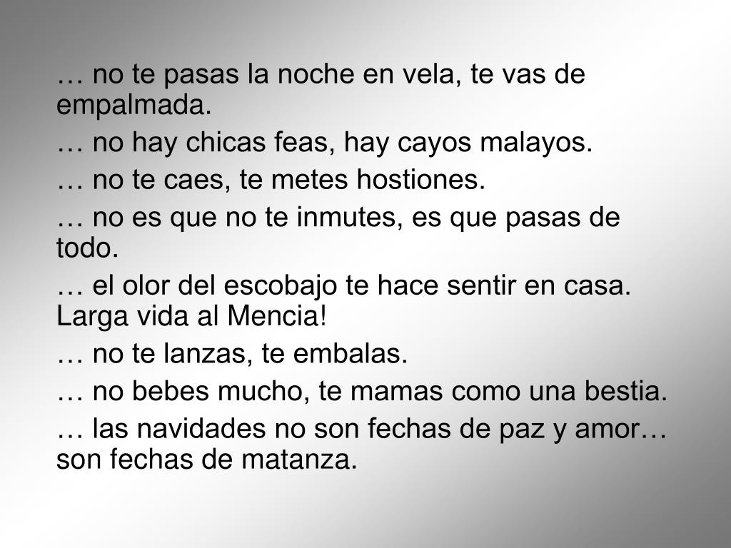… no te pasas la noche en vela, te vas de empalmada. … no hay chicas feas, hay cayos malayos. … no te caes, te metes hostiones. … no es que no te inmutes, es que pasas de todo. … el olor del escobajo te hace sentir en casa. Larga vida al Mencia! … no te lanzas, te embalas. … no bebes mucho, te mamas como una bestia. … las navidades no son fechas de paz y amor… son fechas de matanza.