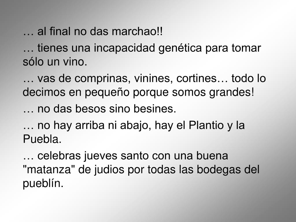 … al final no das marchao!! … tienes una incapacidad genética para tomar sólo un vino. … vas de comprinas, vinines, cortines… todo lo decimos en pequeño porque somos grandes! … no das besos sino besines. … no hay arriba ni abajo, hay el Plantio y la Puebla. … celebras jueves santo con una buena "matanza" de judios por todas las bodegas del pueblín.