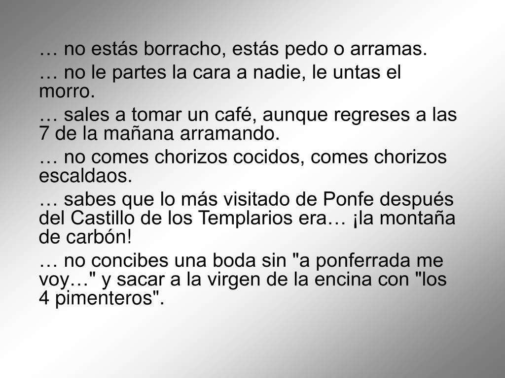 … no estás borracho, estás pedo o arramas. … no le partes la cara a nadie, le untas el morro. … sales a tomar un café, aunque regreses a las 7 de la mañana arramando. … no comes chorizos cocidos, comes chorizos escaldaos. … sabes que lo más visitado de Ponfe después del Castillo de los Templarios era… ¡la montaña de carbón! … no concibes una boda sin "a ponferrada me voy…" y sacar a la virgen de la encina con "los 4 pimenteros".