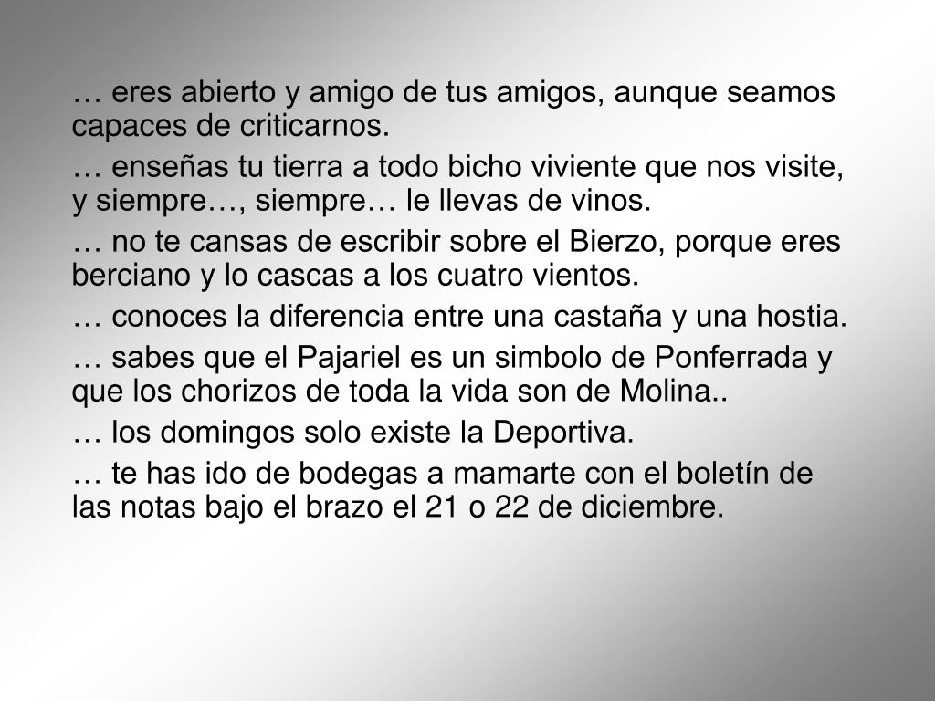 … eres abierto y amigo de tus amigos, aunque seamos capaces de criticarnos. … enseñas tu tierra a todo bicho viviente que nos visite, y siempre…, siempre… le llevas de vinos. … no te cansas de escribir sobre el Bierzo, porque eres berciano y lo cascas a los cuatro vientos. … conoces la diferencia entre una castaña y una hostia. … sabes que el Pajariel es un simbolo de Ponferrada y que los chorizos de toda la vida son de Molina.. … los domingos solo existe la Deportiva. … te has ido de bodegas a mamarte con el boletín de las notas bajo el brazo el 21 o 22 de diciembre.