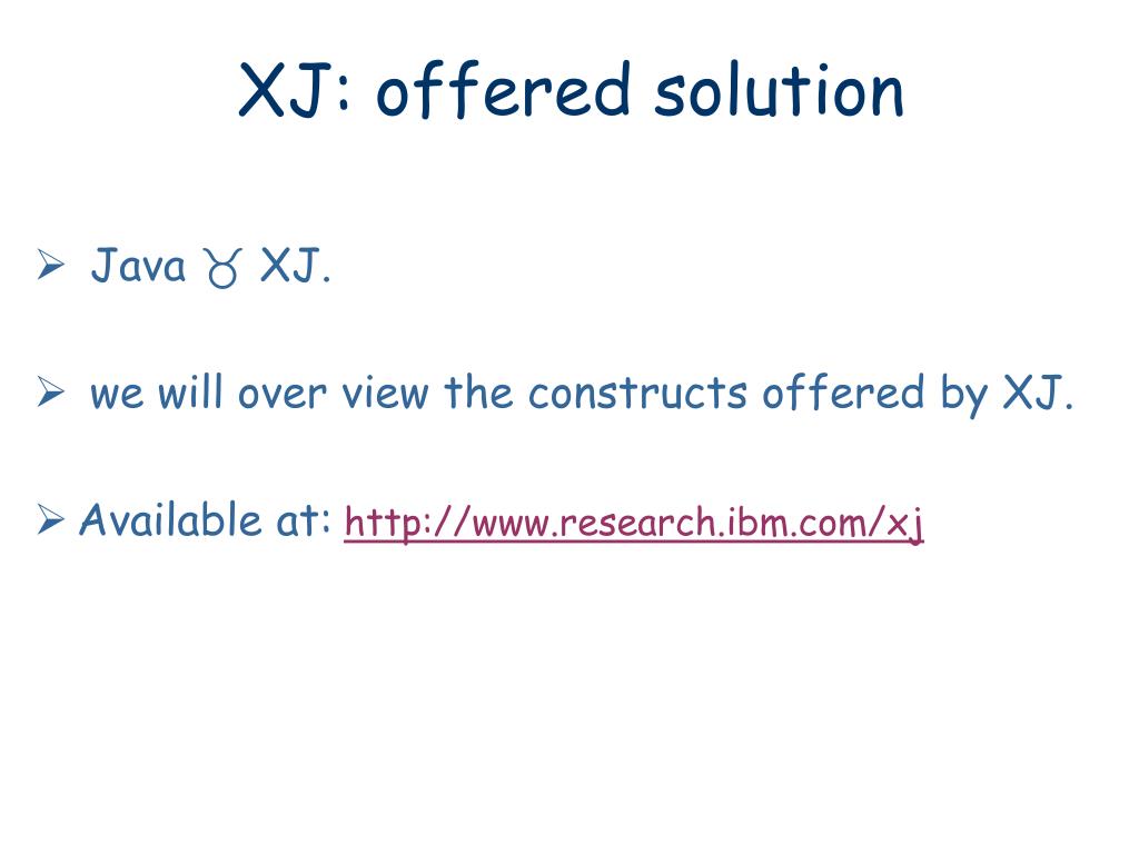 XJ: offered solution • Java XJ. • we will over view the constructs offered by XJ. • Available at:http://www.research.ibm.com/xj