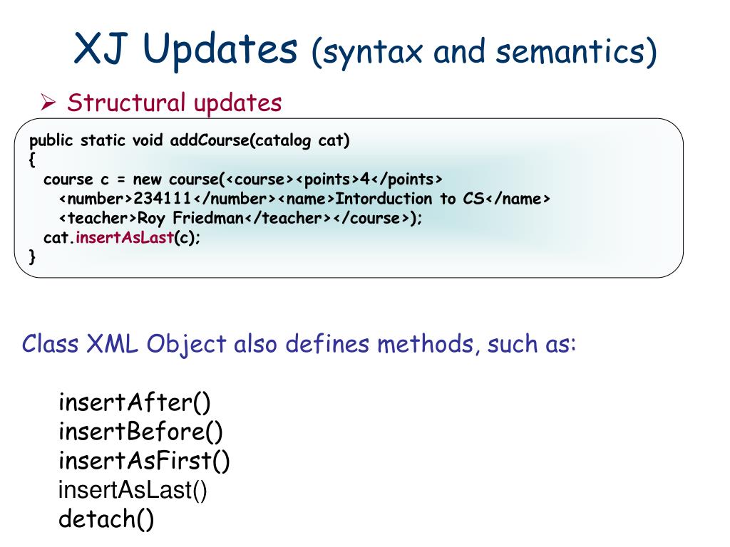 XJ Updates (syntax and semantics) public static void addCourse(catalog cat) { course c = new course(<course><points>4</points> <number>234111</number><name>Intorduction to CS</name> <teacher>Roy Friedman</teacher></course>); cat.insertAsLast(c); } • Structural updates • Class XML Object also defines methods, such as: • insertAfter() • insertBefore() • insertAsFirst() • insertAsLast() • detach()