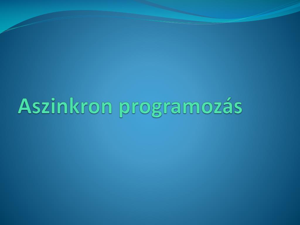 Aszinkron hívást végrehajtó metódus • A neve előtt: async • Elnevezési konvenció: …Async(…) vagy …TaskAsync(…) • A visszatérési értéke: • void– ha nem várunk visszatérési értéket, és nem akarjuk tudni, hogy mikor fejeződött be • Task– ha nem várunk visszatérési értéket, de szinkronizálni akarunk hozzá valami más tevékenységet var x= Obj.DoAsync();… // Itt jönnek azok a műveletek amelyek végrehajthatók, … // amíg az aszinkron művelet befejeződikawait x; • Task<T> - T típusú visszatérési értéket várunk SyndicationFeedsf= awaitclient.RetrieveFeedAsync(rss); • Névtelen metódus és lambda kifejezés is lehet async