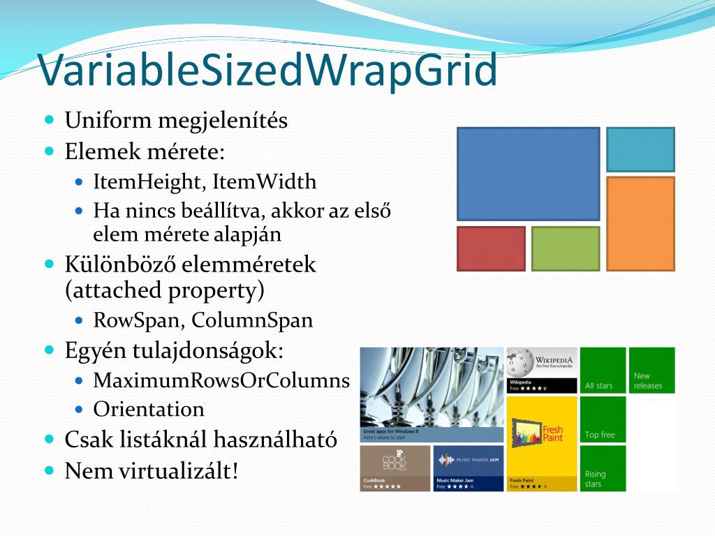 VariableSizedWrapGrid • Uniform megjelenítés • Elemek mérete: • ItemHeight, ItemWidth • Ha nincs beállítva, akkor az első elem mérete alapján • Különböző elemméretek (attached property) • RowSpan, ColumnSpan • Egyén tulajdonságok: • MaximumRowsOrColumns • Orientation • Csak listáknál használható • Nem virtualizált!