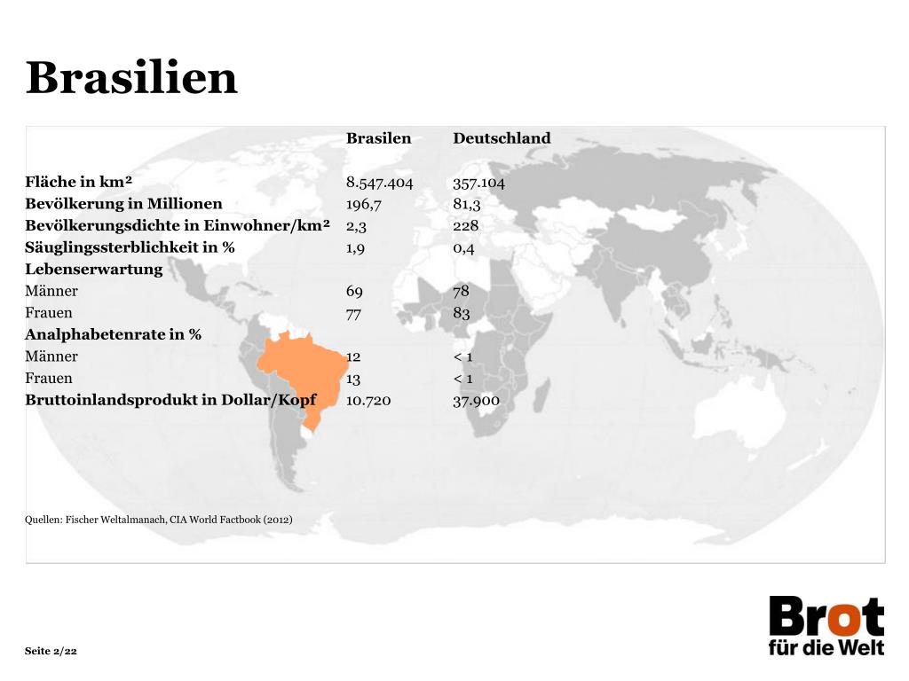 Brasilien Brasilen Deutschland Fläche in km² 8.547.404 357.104 Bevölkerung in Millionen 196,7 81,3 Bevölkerungsdichte in Einwohner/km² 2,3 228 Säuglingssterblichkeit in % 1,9 0,4 Lebenserwartung Männer 69 78 Frauen 77 83 Analphabetenrate in % Männer 12 < 1 Frauen 13 < 1 Bruttoinlandsprodukt in Dollar/Kopf 10.720 37.900 Quellen: Fischer Weltalmanach, CIA World Factbook (2012) Brasilien