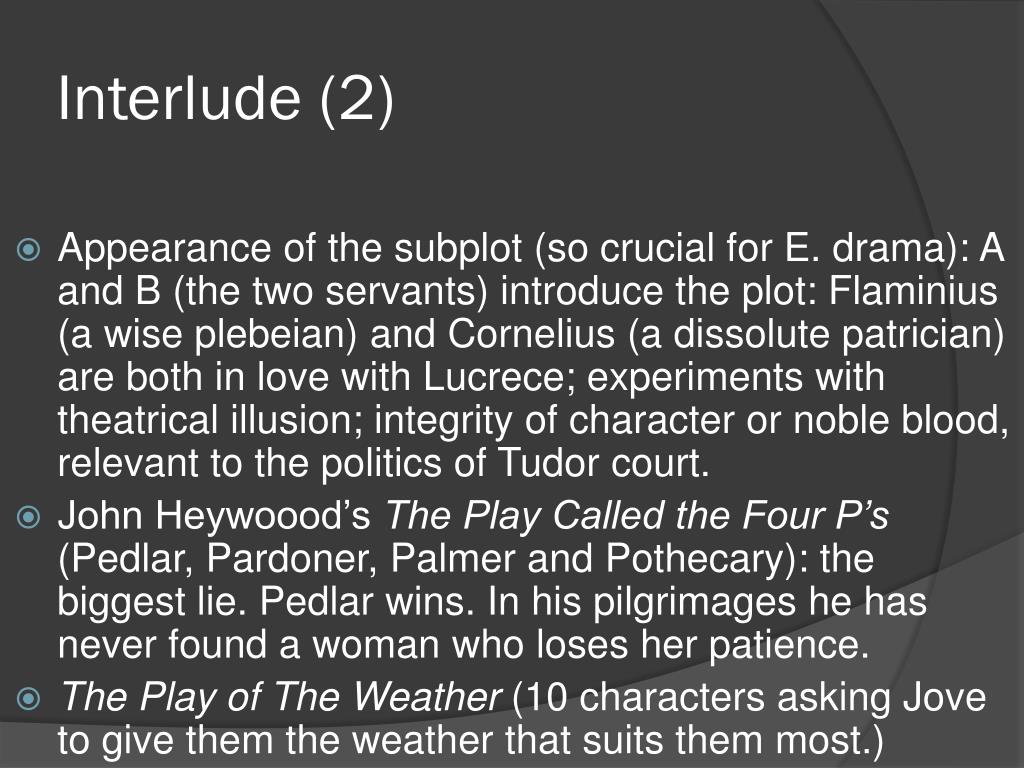 Interlude (2) • Appearance of the subplot (so crucial for E. drama): A and B (the two servants) introduce the plot: Flaminius (a wise plebeian) and Cornelius (a dissolute patrician) are both in love with Lucrece; experiments with theatrical illusion; integrity of character or noble blood, relevant to the politics of Tudor court. • John Heywoood’s The Play Called the Four P’s (Pedlar, Pardoner, Palmer and Pothecary): the biggest lie. Pedlar wins. In his pilgrimages he has never found a woman who loses her patience. • The Play of The Weather (10 characters asking Jove to give them the weather that suits them most.)