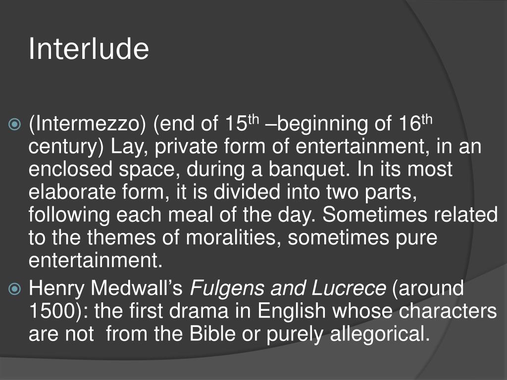 Interlude • (Intermezzo) (end of 15th –beginning of 16th century) Lay, private form of entertainment, in an enclosed space, during a banquet. In its most elaborate form, it is divided into two parts, following each meal of the day. Sometimes related to the themes of moralities, sometimes pure entertainment. • Henry Medwall’s Fulgens and Lucrece (around 1500): the first drama in English whose characters are not from the Bible or purely allegorical.