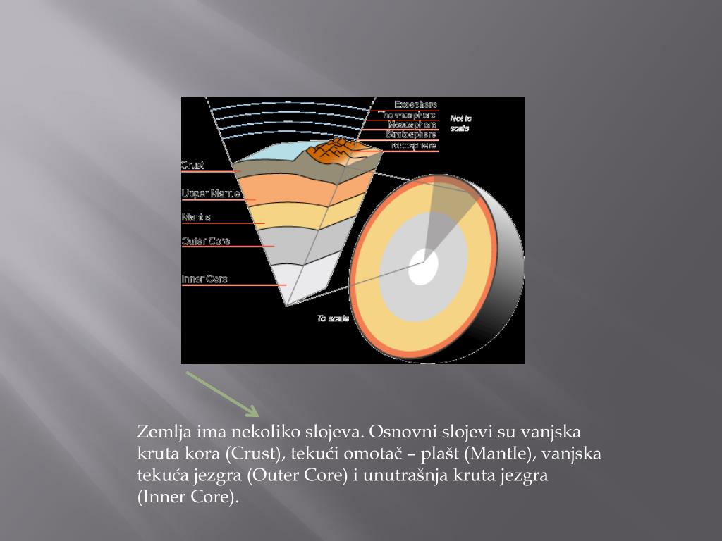 Zemlja ima nekoliko slojeva. Osnovni slojevi su vanjska kruta kora (Crust), tekući omotač – plašt (Mantle), vanjska tekuća jezgra (OuterCore) i unutrašnja kruta jezgra (InnerCore).